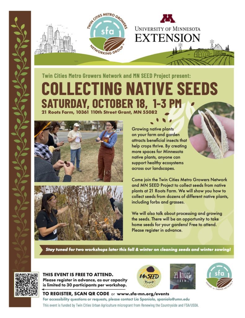 This fall and winter, join the Twin Cities Metro Growers Network and MN SEED Project for a three-part workshop series that will teach you how to collect, clean and sow native seeds to grow your own beautiful and beneficial native landscapes. Growing native plants on your farm and garden attracts beneficial insects that help crops thrive. By creating more spaces for Minnesota native plants, anyone can support healthy ecosystems across our landscapes. This is the first workshop in our series!