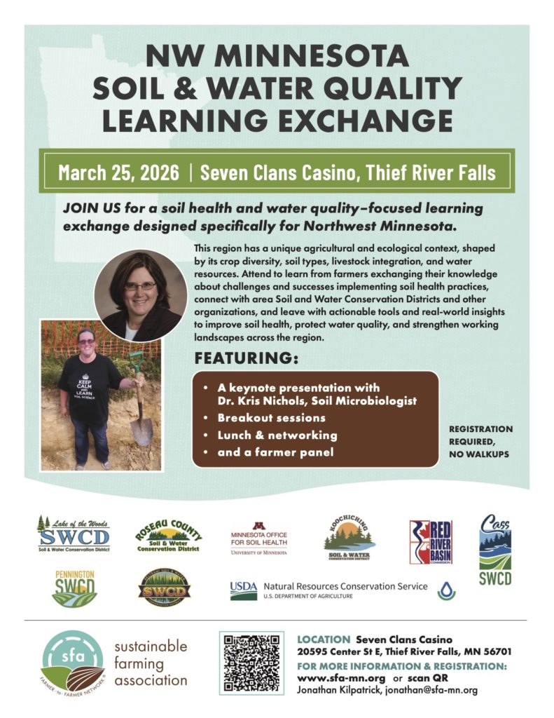 The Sustainable Farming Association, in partnership with Lake of the Woods and Roseau County SWCDs, is launching a soil health & water quality focused learning exchange in Northwest Minnesota. While many similar events are held in central and southern parts of the state, distance can be a barrier to participation for our northern farmers and ranchers. This region has unique opportunities: greater crop diversity, lower land values, and more livestock—all opportunities that create a unique context. Together with local SWCDs and partner organizations, we aim to host a valuable, one-day learning exchange that equips farmers and communities with practical tools to improve soil, protect water, and strengthen ecosystems. Join us in making this inaugural gathering a success!