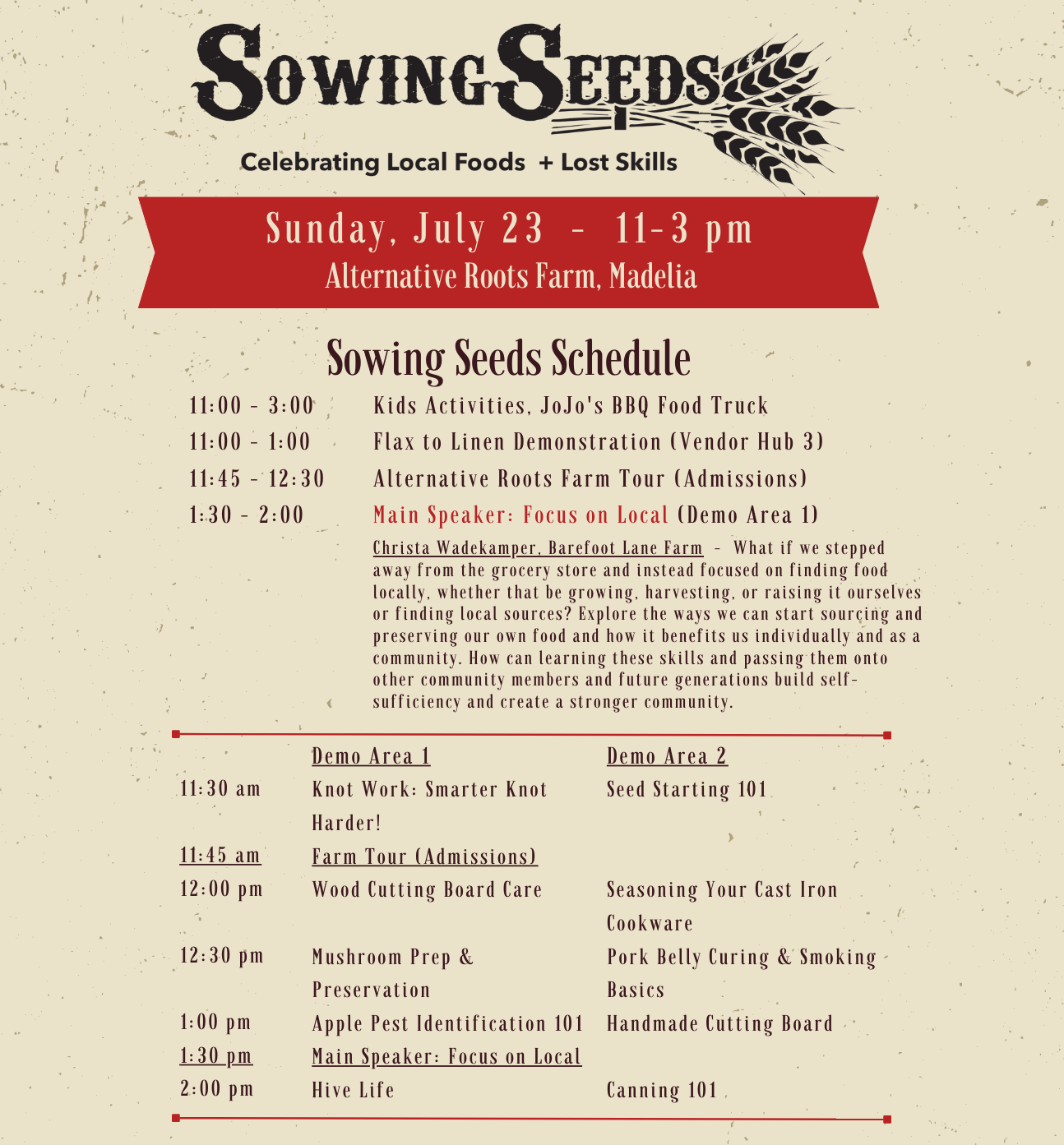 Watch for more info on the day’s schedule, vendors, main speaker, etc. to come!! For more updates and demo details check out the Sowing Seeds facebook event.