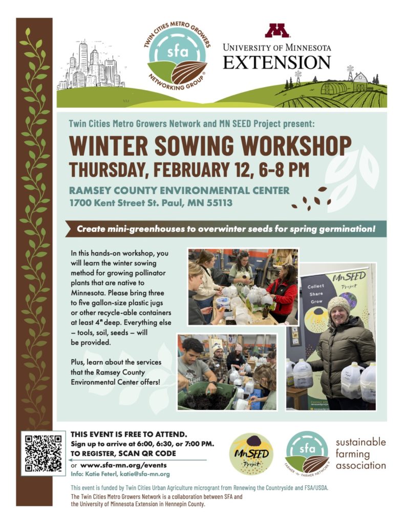 Join the Twin Cities Metro Growers Network for our final installment of our workshop series with MN SEED Project! Participants will have the opportunity to winter sow pollinator plants for their growing spaces. Bring 3 to 5 gallon size plastic jugs or other recycle-able containers at least 4″ deep and we will transform them into mini-greenhouses. Everything else – tools, soil, seeds will be provided. We will be creating mini-greenhouses for the seeds to overwinter in outside and germinate in the spring when the temperatures warm up enough. Plus, learn about the services that the Ramsey County Environmental Center offers.